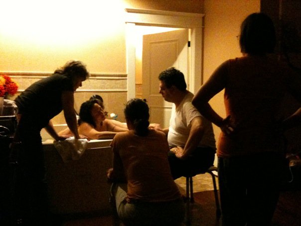 UPDATE: Okay, now we are having some solid contractions. Kelena, Michele's dad, is in the tub with her to give back support and massage.